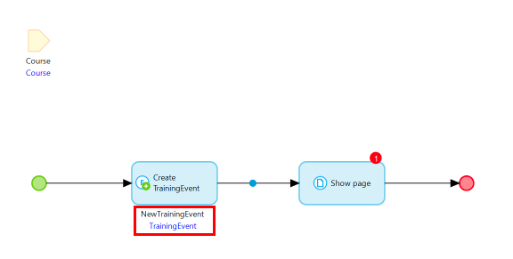 페이지 표시 이벤트는 TrainingEvent_NewEdit 페이지를 엽니다. 이 페이지에는 교육 이벤트 개체가 필요하지만 마이크로 플로우에 아직 해당 개체가 없습니다. 이것이 오류가 발생하는 이유입니다.