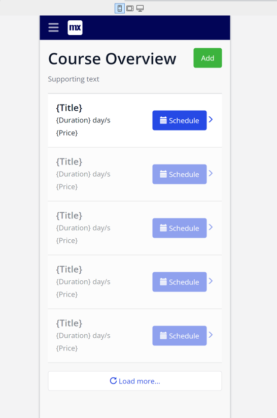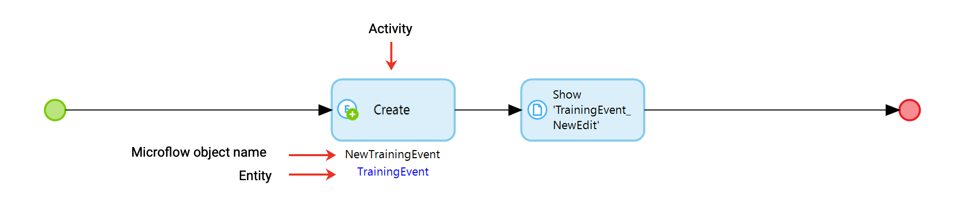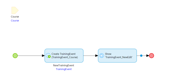 이를 위해 코스 개요 페이지의 목록 보기 위젯에 새 교육 이벤트를 생성하는 버튼을 추가합니다. 이 버튼에는 교육 이벤트 객체를 생성하고 TrainingEvent_NewEdit 페이지를 여는 마이크로플로우가 필요합니다.