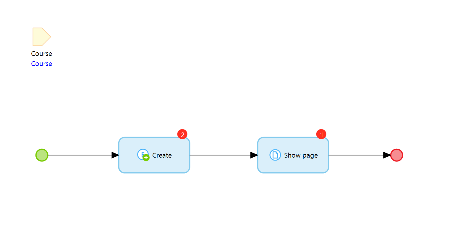 이 마이크로플로우에는 시작 이벤트와 종료 이벤트가 있으며 그 사이에 흐름이 있습니다. Course 유형의 매개변수도 볼 수 있습니다. 이 매개 변수는 교육 이벤트를 예약하려는 코스를 나타냅니다.