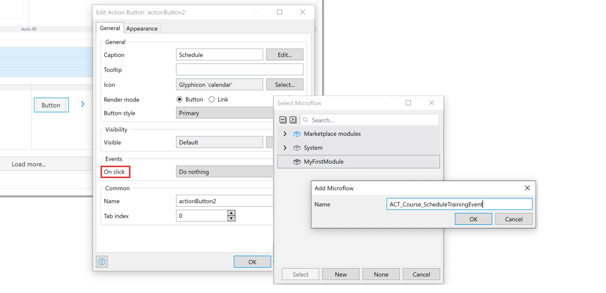 클릭 시 필드에서 마이크로플로우 호출을 선택합니다. 마이크로 플로우 선택 팝업에서 이 새 마이크로 플로우를 생성해야 하므로 새로 만들기를 선택합니다. 마이크로플로우의 이름을 ACT_Course_ScheduleTrainingEvent로 지정합니다. 확인을 클릭합니다.