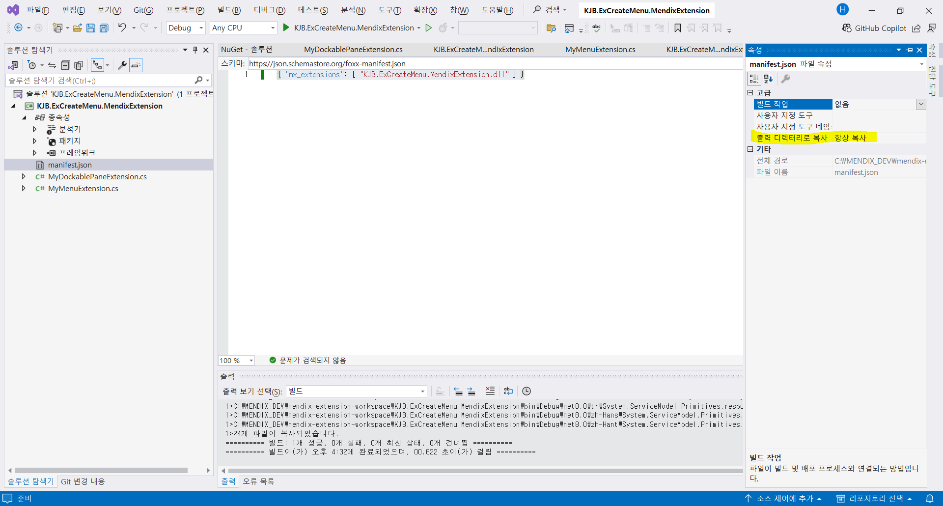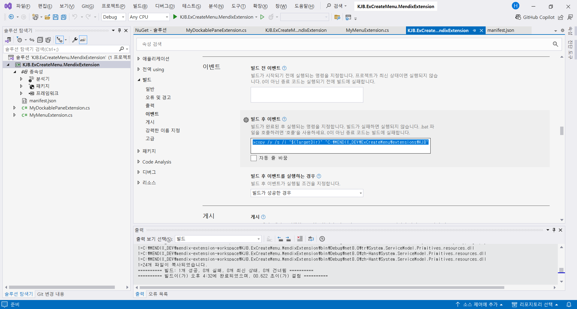 익스테션 빌드시 위의 폴더로 자동 복사하기위한 빌드 후 이벤트 추가
